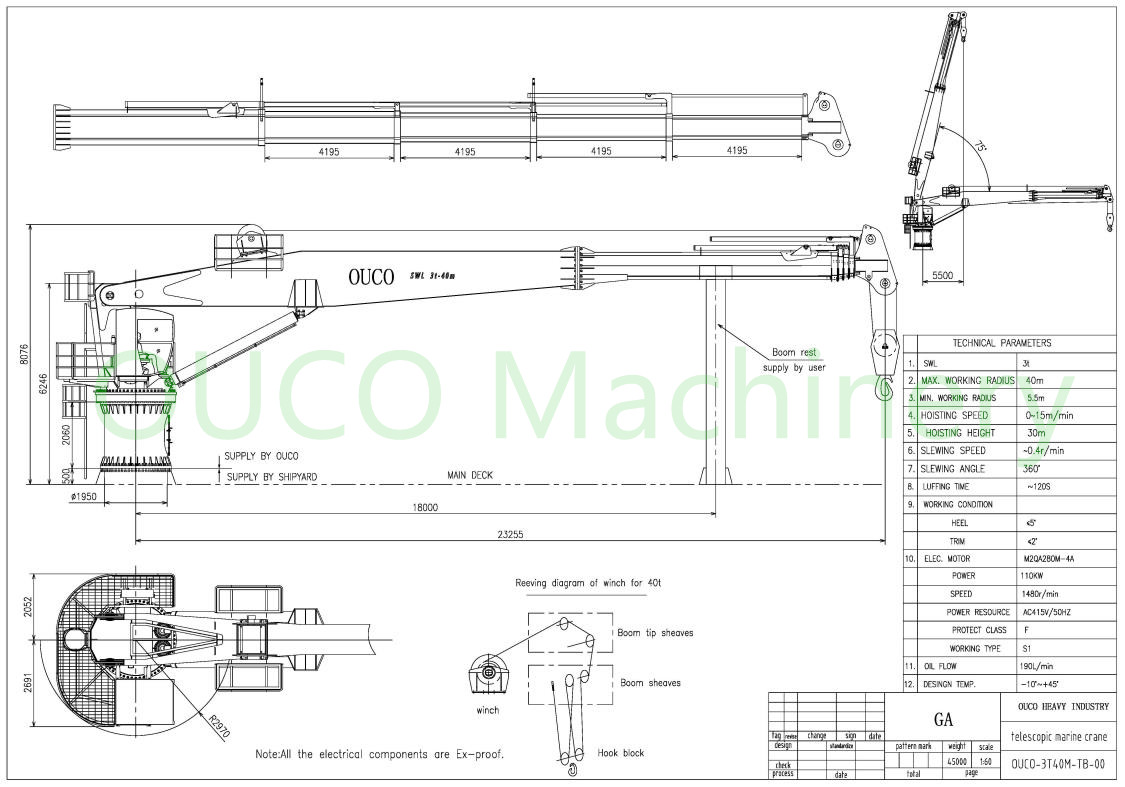 OUCO Marine/Offshore 3T40M Telescopic boom crane is mainly used on the deck of bulk carrier or overload barge for handling a variety of cargo bulks.